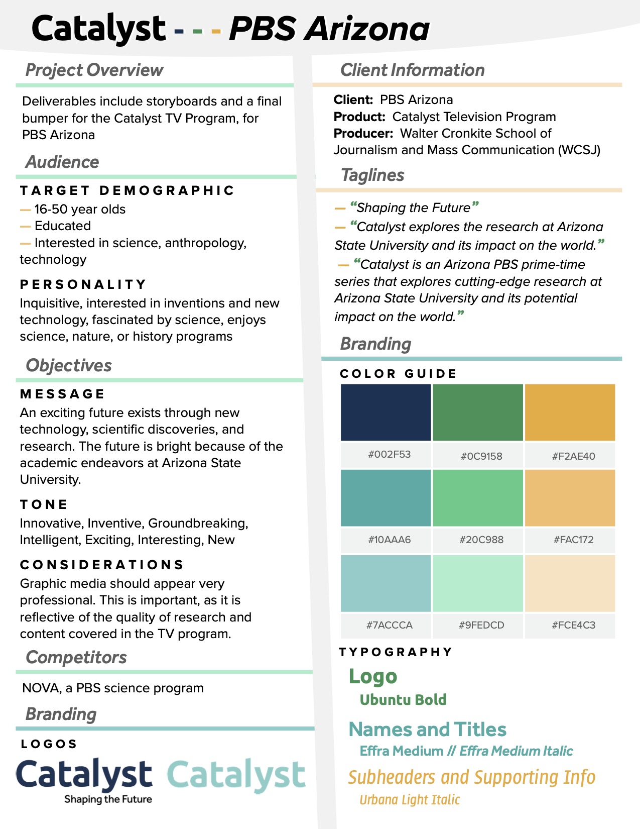 PBS Arizona needed a commercial transition bumper for their Catalyst program. Following the provided brand guidelines, an animation of the logo and tagline was created, as seen above.